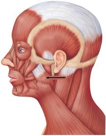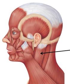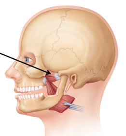 Name Origin: Insertion: Function: Innervation: | Masseter Origin: Zygomatic arch. Insertion: Lateral surface of the ramus of the mandible Function: Elevates the mandible and deep part can retrude the mandible. Innervation: Masseteric nerve of mandibular (V3). |