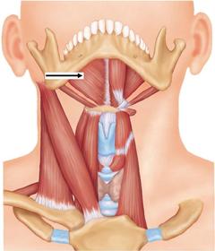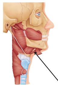 Name Origin: Insertion: Function: Innervation: | Digastric Origin: Two bellies; the anterior belly originates from the anteromedial surface of the mandible, the posterior belly originates from the medial aspect of the mastoid process. Insertion: Both bellies attach to an intermediate tendon, linking to the hyoid bone. Function: Raise the hyoid bone, or, if the hyoid bone is fixed, depress the mandible as well as retract. Innervation: Anterior belly; mylohyoid nerve, originating from the inferior alveolar nerve, a branch of the mandibular (V3). Posterior belly; digastric branch of the facial nerve (cranial nerve 7) |