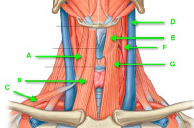 Name A, B, G, E Origin: Insertion: Function: Innervation: | A: Omohyoid Origin/insertion: Consists of two bellies; the inferior belly originates from the upper surface of the scapula and then passes anterior deep to the sternocleidomastoid attaching to an intermediate tendon, held in place by a fibrous loop to the clavicle. The superior belly extends from the intermediate tendon to the body of the hyoid bone. B: Sternohyoid: Superficial Origin: Manubrium of the sternum and medial end of the clavicle. Insertion: Body of the hyoid bone. G: Sternothyroid: Deep to sternohyoid Origin: Manubrium of the sternum. Insertion: Oblique line of the thyroid cartilage. E: Thyrohyoid: Origin: Oblique line of the thyroid cartilage. Insertion: lower border of the body and lateral horn of the hyoid bone. Function: Anchor the hyoid bone (they fix and steady it) so that the suprahyoid muscles can act. They also depress the hyoid and larynx during swallowing and speaking. Innervation: They are supplied by branches arising from the deep branches of the cervical plexus. |
