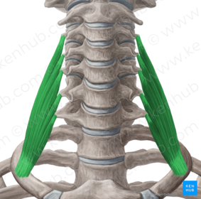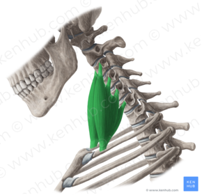 Name Origin: Insertion: Function: Innervation: | Scalenus medius Origin: From the transverse processes of the cervical vertebrae. Insertion: Into the posterior surface of the 1st rib. Function: Can flex the neck laterally. Raises the 1st rib during forced inspiration. Innervation: Cervical spinal nerves. |