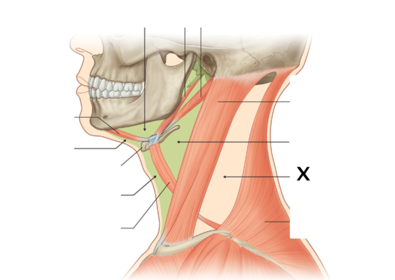Carotid sheath Course: Contents (6): | Carotid sheath(es) Tube of fascia that extends from the base of the skull to the root of the neck. It blends anteriorly with the investing and pretracheal fascia and posteriorly with the prevertebral fascia. It contains: Common and internal carotid arteries (surrounded by sympathetic fibres forming plexuses). Internal jugular vein and deep cervical lymph nodes. Vagus nerve (X). |