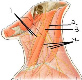 Name Origin: Location: Groups of branches (2): Supplies: Cutaneous branches (4): | Cervical plexus Location: Is found in the posterior triangle. Origin: Formed by the union of the first four cervical spinal nerves joined together by simple loops. It lies deep the sternocleidomastoid muscle. Groups of branches: The branches of the plexus can be divided into deep and superficial groups. Deep branches supply muscles. Superficial branches are distributed to the skin of the anterior and lateral sides of the neck and the lateral aspect of the head. Cutaneous branches from the plexus emerge around the middle of the posterior border of the sternocleidomastoid muscle. There are four cutaneous branches: Transverse cervical nerve (1). Great auricular nerve (3). Lesser occipital nerve (2). Superior clavicular nerves (4). |