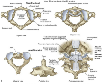 The atlas and axis (C1 and 2) Descriptions: Joints and movements(2): Ligaments (2): | The atlas (C1): Has no spinous process or body and consists of two lateral masses connected by anterior and posterior arches. Its concave superior articular facets receive the occipital condyles. Atlanto-occipital joints: Permits nodding of the head on the vertebral column. The axis (C2): The distinguishing feature is the dens that projects superiorly from its body. Transverse ligament of the atlas: Strong band extending between the lateral masses of C1 holding the dens of C2 against the inner surface of the anterior arch of C1. Atlantoaxial joints: Permits the head to be moved from side to side. Dens acts as a pivot that allows the skull and C1 as a unit to rotate on C2. Alar ligaments: Extend from the sides of the dens to the lateral margins of the foramen magnum. They check excessive rotation of the head and atlas relative to the axis. |