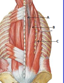 Collective and individual names: | Erector spinae: Consists of 3 muscles: Iliocostalis (C). Longissimus (B). Spinalis (A). |