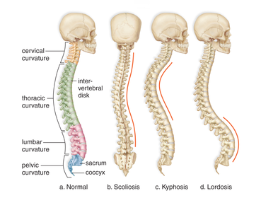 Curvatures of the spine Normal types (2): Descriptions: Development: | Primary curvature (kyphosis; concave anteriorly, convex posteriorly): Develops during the foetal period. Secondary curvature (lordosis; convex anteriorly, concave posteriorly): Begins to appear before birth and are accentuated when an infant begins to hold its head erect. The secondary curvatures are caused mainly by differences in thickness between the anterior and posterior parts of the intervertebral discs. |