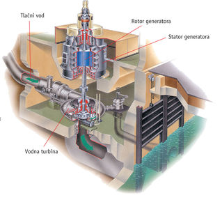 | Vodne turbine. Pretvara energiju vode u mehaničku energiju. Pokreće generator. | |