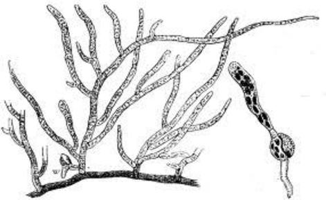 | moss protonema. this is the early stage of the development of the gametophyte. these tentical like projects grew from the spore that was produced during the sporphyte generation. soon buds will form into leafy gametophyte and into a fully grown mass plant | |