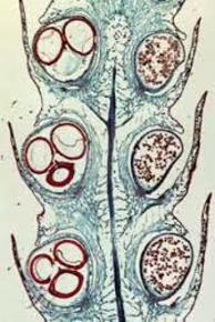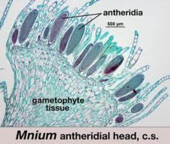 | This is the antheridial head. the antheridia shown in the picture are oval shaped structures with non reproductive cells around it. flagellated sperm are produced inside. these antheridia are separated by non reproductive filaments of cells called paraphyes | |