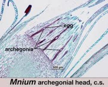 | this is the archeological head. found in female gametophytes. its a cluster of archegonium which are vase shaped structure where egg cells are produced. water will then bring sperm from antheridial head a diploid zygote will be made and then continue to grow while attached to the gametophyte | |