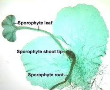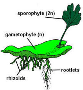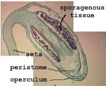 | the sporphyte has a foot that stays anchored in the female gametophyte. a stalk called a seta grows up and a capsule grows at the top. | |