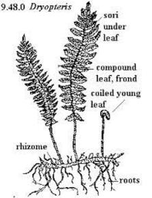 | the visible part of the plant is called the fronds. they are attached to an underground stem called the rhizome. this is the diploid sporophyte stage. the red dots under the leaf are called sori or a cluster called sporangia. the leaves that have sporangia are called sporophylls | |