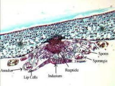 | sori are often covered by a shelf like structure called the indusium that protects them until they are mature. each sporangia has specialized cells with uneven cell walls in a group called the annulus. as the sporangium matures it dries out and the annalus bends. eventually the tension of the water in the annulus is greater then the cohesion. the water becomes vapour the the cells go back to their original shape. the shape change is so quick it literally whips the spores away a great distance | |