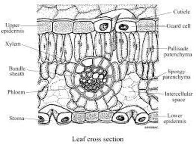 | under the upper epidermis are tightly packed cells called the palisade layer. below this are loosely arranged cells with intercellular space called the spongy mesophyll layer. below this you will see veins of xylem and phloem cells for vascular transport. xylem tissue transport water and minerals and supports terrestrial plants. phloem tissue moves food around the plant and as a conducting agent | |