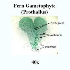 | the small black dots on or hear the rhizoids of the prothallus are called the antheridia. as with moss, sperm is produced here and must be transported by water. the vase like strucutres near the notch of the prothallium are the achegonia and are where the eggs are produced. although the antheridia and the achegonia are close together they develop at different times so cross fertilization can occur. | |