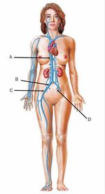 | Match the arrow with the vein. | A: Inferior vena cava B: Common iliac C: External iliac D: Internal iliac |