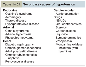 | 948 As part of an examination of a pt with HT what clinical signs should be sought that may reveal an underlying cause or subsequent effects? | * Renal artery bruits - renovascular HT * Radiofemoral delay - coarctation of the aorta * Cardiac examination may reveal signs of LVH & a loud 2nd HT sound * If cardiac failure develops there may be a sinus tachycardia & a 3rd HT sound * Fundoscopy - tortuosity of the retinal arteries, arteriovenous nipping, haemmorhages, soft exudates, papilloedema. K & C. |