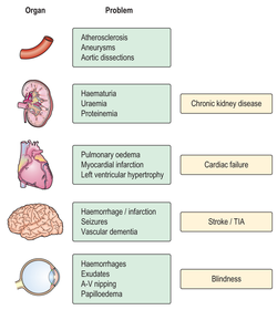 | 952 Define accelerated/malignant HT & describe the pathology of target organ damage caused by accelerated HT. | Hypertensive emergencies include both accelerated HT & malignant HT. In both cases a recent ^BP to very high levels (≥180 mm Hg systolic & ≥110 mm Hg diastolic) results in target organ damage - usually seen as neurological (eg encephalopathy), cardiovascular or renal damage. The term malignant HT is usually reserved for cases where papilloedema is present. http://patient.info/doctor/hypertensive-emergencies |