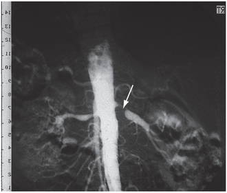 | 944 What potential cause of HT does this angiograph show? | Digital subtraction angiography, showing typical unilateral atheromatous renal artery stenosis with post-stenotic dilatation (arrow). K & C. |