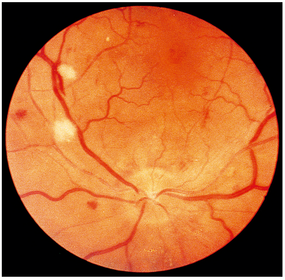 | 944 What hypertensive changes are seen in this fundus? | Fundus showing hypertensive changes: Grade 4 retinopathy with papilloedema, haemorrhages and exudates. K & C. |