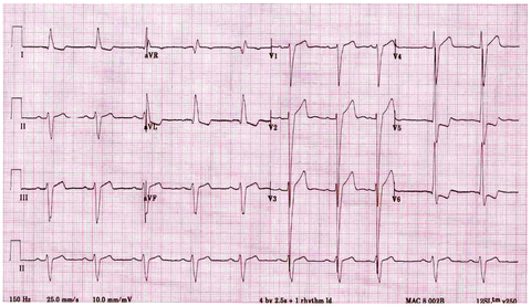 | What ECG change is seen here that may be due to HT & what criteria may be used to Dx it? | LVH. The most commonly used criteria for diagnosing LVH is the Sokolov-Lyon criteria (S wave depth in V1 + tallest R wave height in V5-V6 > 35 mm). http://lifeinthefastlane.com/ecg-library/basics/left-ventricular-hypertrophy/ |