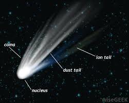 | What is a comet? | a celestial object consisting of a nucleus of ice and dust and, when near the sun, a ‘tail’ of gas and dust particles pointing away from the sun. |
