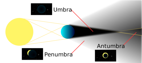 | What is a penumbra? | the partially shaded outer region of the shadow cast by an opaque (not able to be seen through; not transparent.) object. |