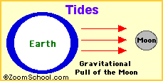 | How are tides formed? | The gravitational attraction of the moon causes the oceans to bulge out in the direction of the moon. Another bulge occurs on the opposite side, since the Earth is also being pulled toward the moon (and away from the water on the far side). Since the earth is rotating while this is happening, two tides occur each day. |