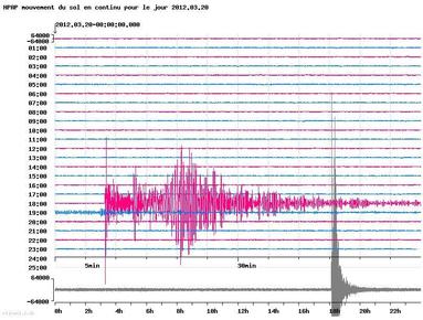 Sismograma é o registo em papel feito pelos sismógrafos dos movimentos do solo, ou seja, os terremotos. Serve para determinar a magnitude de um sismo, que é dada pela Escala de Richter. |