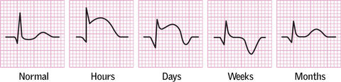 T wave inversion may be considered to be evidence of ischaemia if: At least 1 mm deep Present in ≥ 2 continuous leads that have dominant R waves (R/S ratio > 1) Dynamic — not present on old ECG or changing over time. In this eg - widespread T wave inversion due to myocardial ischaemia (most prominent in the lateral leads. http://lifeinthefastlane.com/ecg-library/myocardial-ischaemia/ | |