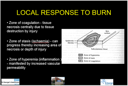 3615 Outline the local response to a burn. | * Inflammatory mediators cause increased micovascular permeability, oedema formation, microvascular stasis, thrombosis * These responses can lead to progressive injury & cell death leading to deeepening of the wound See lecture: https://www.dropbox.com/home/P-Year%20Surgical%20Lectures?preview=Burns+-+Miss+J.+Odili.pptx |