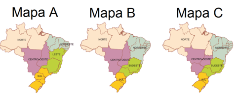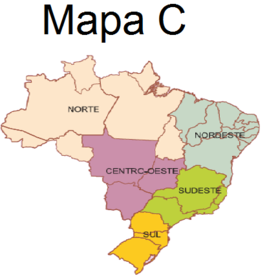 Qual o mapa abaixo apresenta a divisão oficial do Brasil ? | O Mapa C apresenta a divisão oficial de 1988, cujo critério é a divisão político-administrativa. Neste mapa contêm o Estado de Tocantins. |