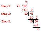| Problem: 60 by 2 Explanation: Set the problem in the long division format. Put 60 inside the "dog house" and 2 outside. Start multiplying. | Solution: 30 |