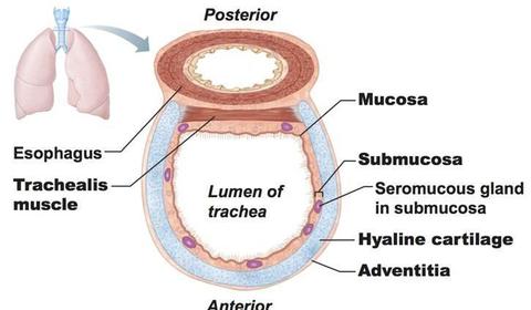 Pseudo stratified ciliated columnar (Mucosa), Hyaline Cartilage ring, trachealis muscle | |