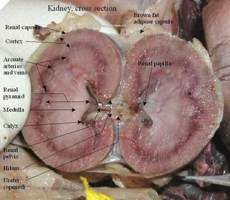 Urinary kidney: adipose capsule, renal capsule, renal hilus, renal pelvis, renal cortex, renal medulla, ureter | |