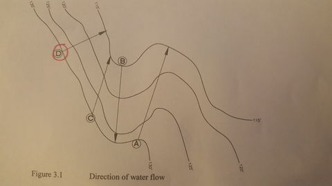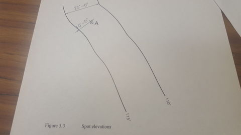 | Assuming a constant slope between the two contour lines shown in Fig 3.3, what is the elevation of point A? a. 112' b. 112.5' c. 113' d. 113.5' e. 114' | c. 113' 115' - 5' x (10'/25') = 115'-2' = 113' |