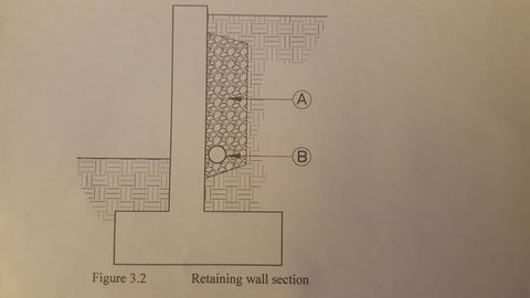 | Which of the following is A, as shown on Figure 3.2? a. Sand b. Soil c. Sand & gravels d. Gravel | d. Gravel To release the hydrostatic pressure behind the retaining wall, neither sand nor soils are the proper materials around perforated pipe. They are too fine and will leak into the pipe. |
