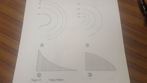 | Refer to figure 3.4. Which of the following shows a convex slope? CHECK THE TWO THAT APPLY. a. A b. B. c. C d. D | A & D. Convex slopes (outward) Concave slopes (CAVE inward). |