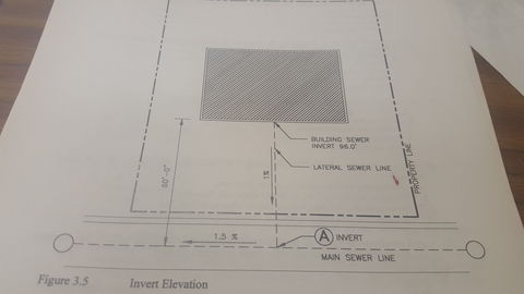 | If the slope for the lateral sewer line is 1% and the slope for the main sewer line is 1.5%, what is the invert elevation at point A as shown in Figure 3.5? a. 95.1 b. 95.3 c. 95.4 d. 96.7 | c. 95.4 60' x 1% = 0.6 96.0 - 0.6 = 95.4" |