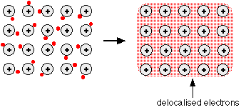 | Metallic Bonding (a potentially infinite lattice) Attraction between Cation (metal) like Fe+ and the shared sea of delocalised electrons | |