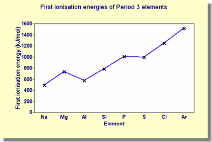 | Mg--->Al new P subshell P--->S P subshell is half filled electrons start to double up and repel each other. | |