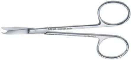 | This instrument may be used to cut suture material, gauze, paper drape material or tubing. They may have sharp tips, blunt tips or one sharp tip and one blunt tip. They may be straight or curved and the cutting edges may be plain or serrated. | Operating Scissors (Jennifer Bobetsky) |