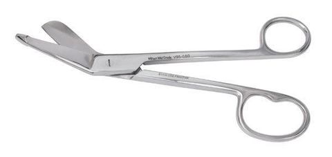 | Scissors for cutting bandage material. Blades bent for cutting at an angle. Top blade is a regular blunt. Bottom blade has a fat triangular blunt end to facilitate sliding under a bandage without catching the skin. | Lister bandage scissors Mimi DiMatteo |