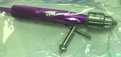 | Handheld instrument used to firmly grasp IM (intramedullary) pins into bone in orthopedic procedures. IM pin held through a gear based locking tightening mechanism. | Jacob's hand chuck and key Rex Ivanchich |