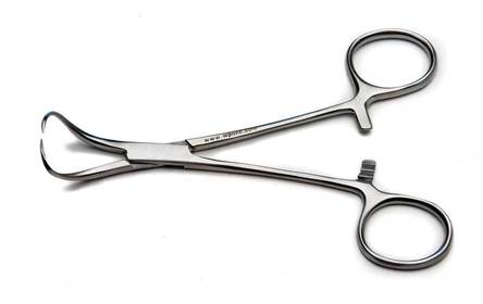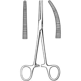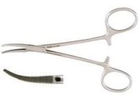| Hemostatic forceps designed to clamp small vessels that must be occluded, crushed or held firmly in place. They are generally equal to or less than 5 ½ inches long with transverse grooves on the entire jaw with a fine tip. The forceps have a self-locking ratchet mechanism. The jaws can be curved or straight. | Halsted Mosquito Forceps (Jennifer Fujita) |