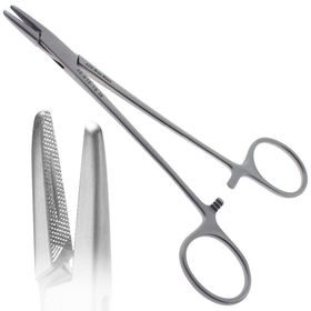 | This instrument is used to secure small delicate needles for various microsurgeries of the eyelid or other fragile tissue. Its allows the needle to be guided when suturing while maintaining a controlled grip pressure. Markings: The jaw can be delicate, fine, or standard and is usually 9mm-14mm long and may either have straight or curved curvature. The tip may be blunt or sharp. The handle is often textured for grip and has clamp locking mechanism on the inside. | Castroviejo needle holder (ophthalmic) |