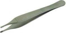 | Used for holding and manipulating delicate tissues. They have a wide, flat thumb grasp area that is commonly striated in one direction. The jaws are short and the tips are narrow. This product is straight with smooth edges, and a length usually of 4-3/4 inches. | Adson Thumb Forceps (Mirella Ceja) |