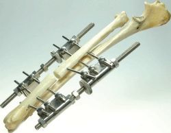 | An external fixator (Ex Fix) is a metal surgical device used to stabilize bones without disrupting the fracture site and are used for fracture stabilization, arthrodesis, and angular limb deformity correction in dogs and cats. They come in many different configurations, but they generally consist of pins placed through the skin and into the bone, and external metal bars which the pins are attached to with the use of special clamps. | External Fixator (Orthopedic) Noel Rideout |