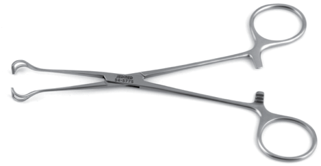 | Ringed locking instrument for clamping tissue. Small curved jaws have zig-zag teeth at the tip. Forceps securely grasp tissue but cause significant tissue crushing and are therefore considered to be “traumatic forceps” and should be used only on tissues that are being removed from the patient (tumors, damaged bowel, etc.) May also be used to secure patient drapes and instrument cords. | Allis Tissue Forceps Mimi DiMatteo |