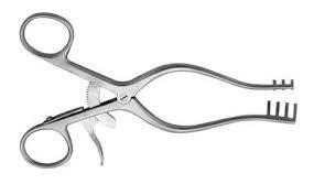 | A self-retaining retractor that maintains a desired position with a locking mechanism which allows the surgeon and the assistant to free up their hands for other tasks. It increases exposure of the abdominal cavity. Blunt prongs face outward to hold tissue edges open. Used in medium to large-sized sites & primarily spinal muscle retraction. The instrument is shaped like scissors with downward pointing prongs at the tip, with either sharp or blunt blades. This retractor has ratchet (unidirectional) mechanism through which it is locked in position. This instrument should be handled with care because the sharp tips can damage underlying tissue. | Weitlaner Retractor Stacey Perlman |