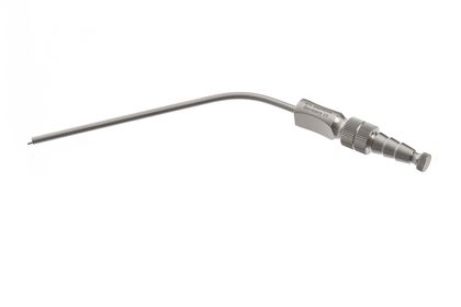 | a thin curved instrument used in dental and open surgical procedures for removing fluids from oral, nasal, lumbar, and cervical cavities, as well as intracranially. They are commonly used in small animal dentistry for aspirating fluid, bone, or tooth fragments. Their identifiable structures are that they are angled and come with an obturator and a finger valve. | Frazier Suction Tip (Alyssa Brandau) |